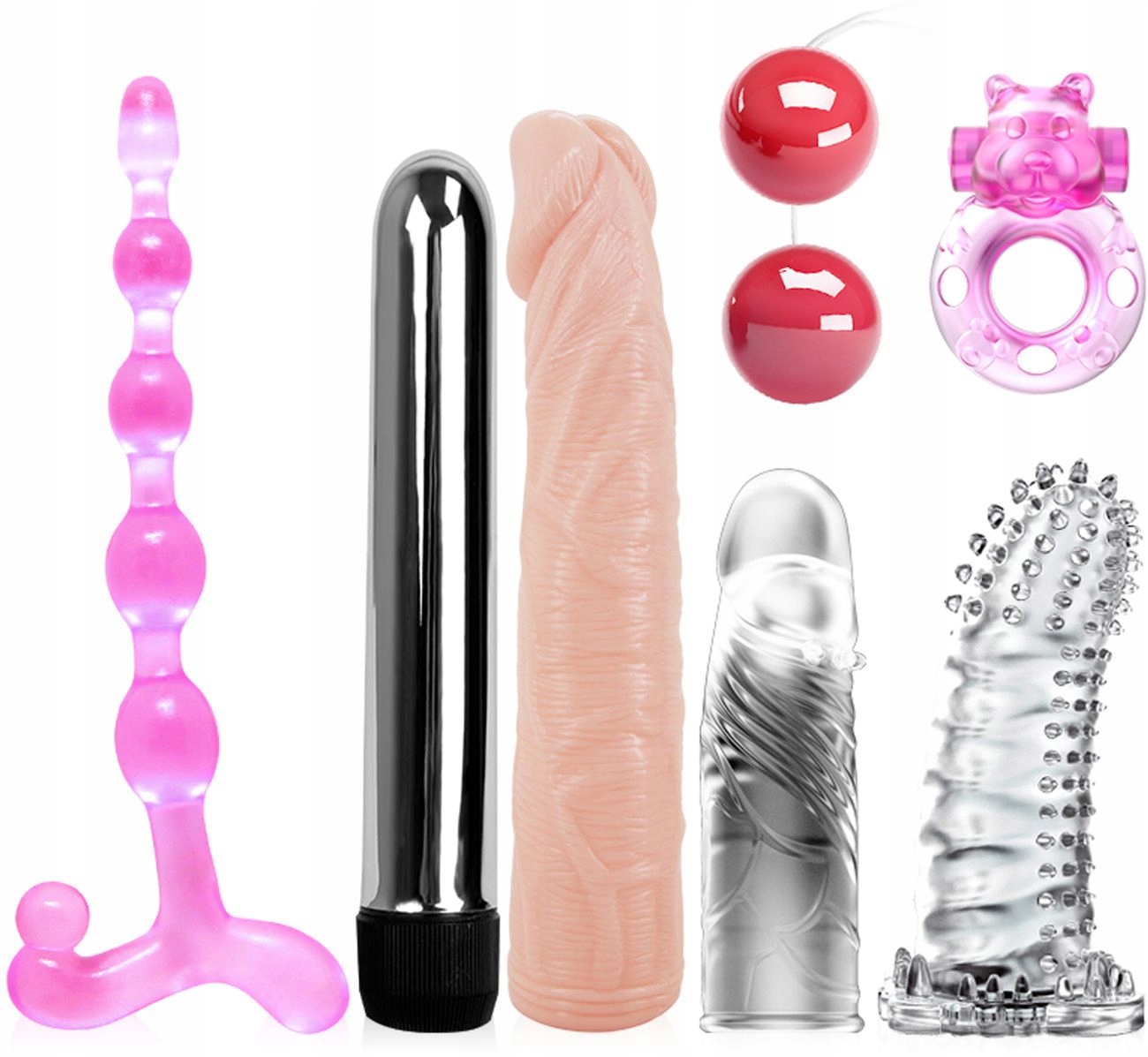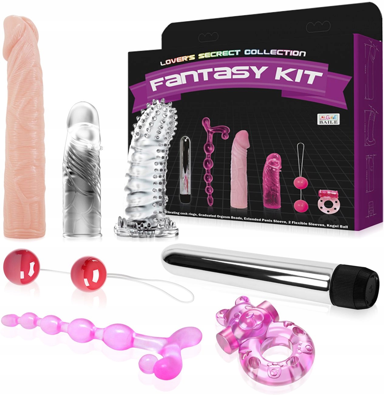 Un conjunto de juguetes sexuales para parejas FANTASY KIT. Hasta 7 sex gadgets que te permitirán tener un excelente juego previo y sexo lleno de sensaciones increíbles. ¡Olvídate del aburrimiento en el dormitorio! El clásico bolígrafo vibrador con intensidad de vibración ajustable mimará tu vagina, ano, clítoris, pezones y todos los demás lugares erógenos de tu cuerpo. 3 almohadillas de gel para la erección, incluida una que agranda el pene hasta 6 cm, permitirán más placer y satisfacción durante las relaciones sexuales. Durante el juego en solitario, puedes poner las almohadillas en el vibrador y ver qué tipo de caricias te llevarán al orgasmo más rápido. El anillo vibrador para el pene hará cosquillas y excitará tu vagina y clítoris con cada embestida. Una sonda anal graduada introducirá la excitación erótica rompiendo todos los tabúes, y las bolas vibrantes de geisha estimularán su vagina o ano para aún más experiencias de flexión de rodillas. El empaque estético hace que el conjunto sea perfecto para un regalo.